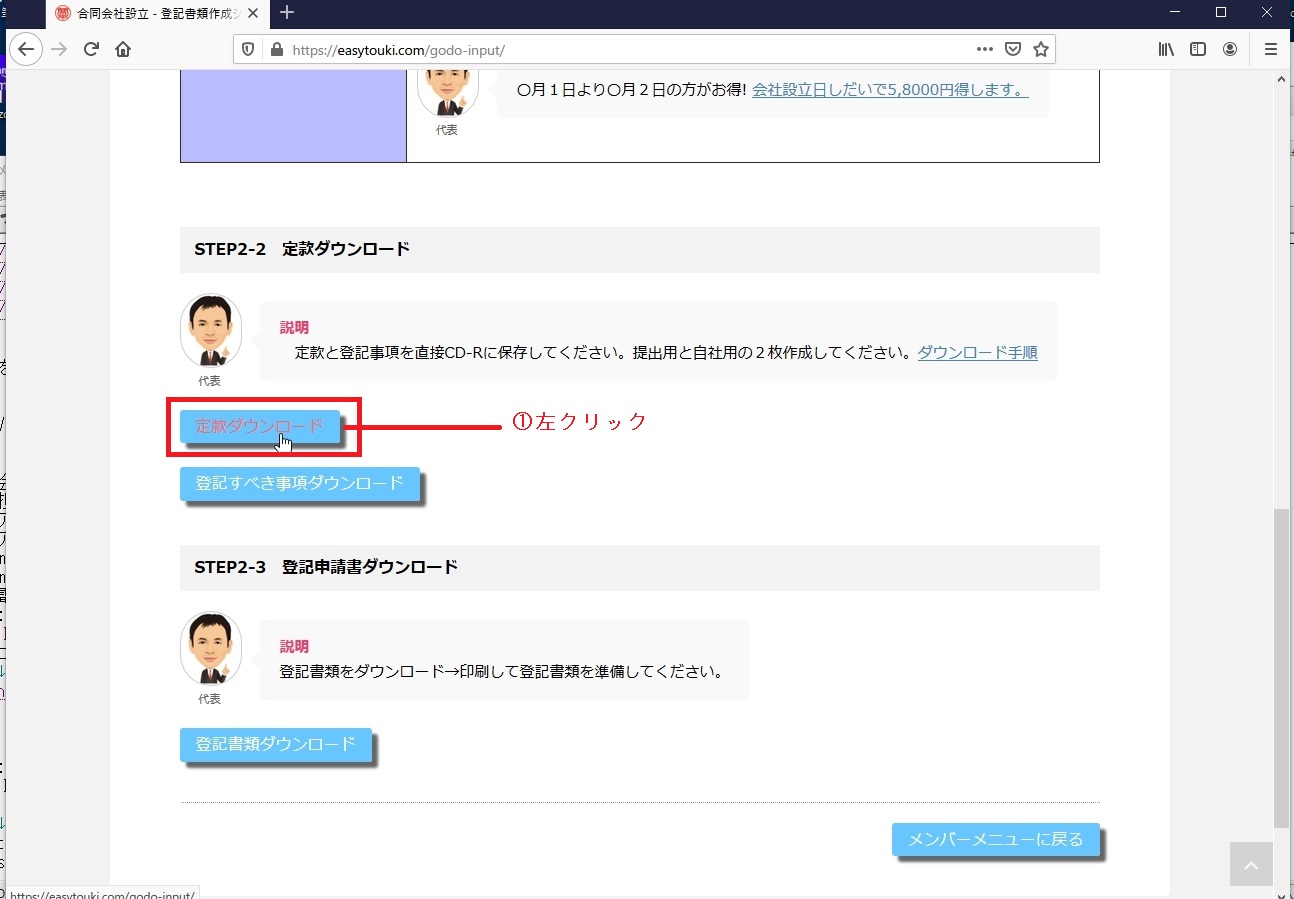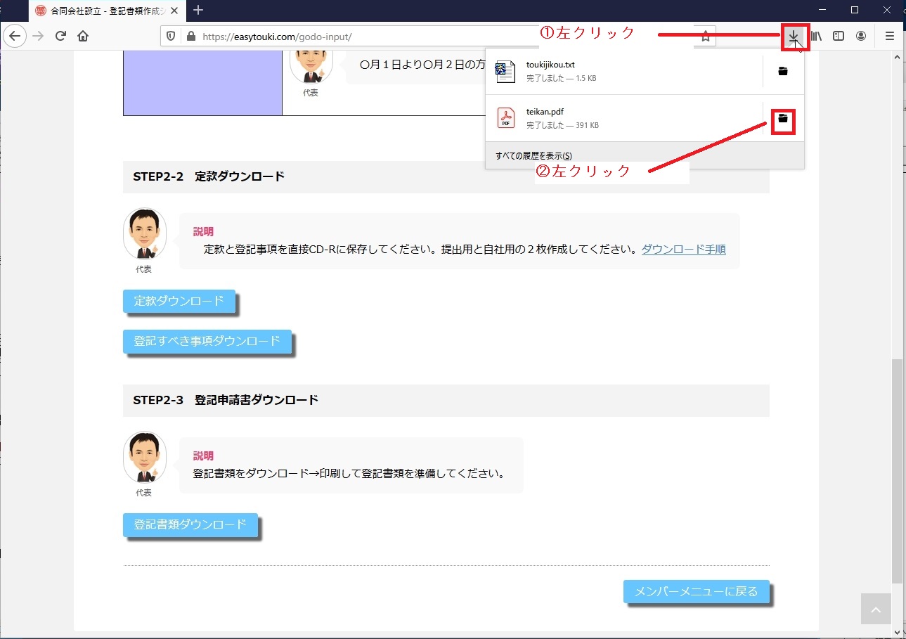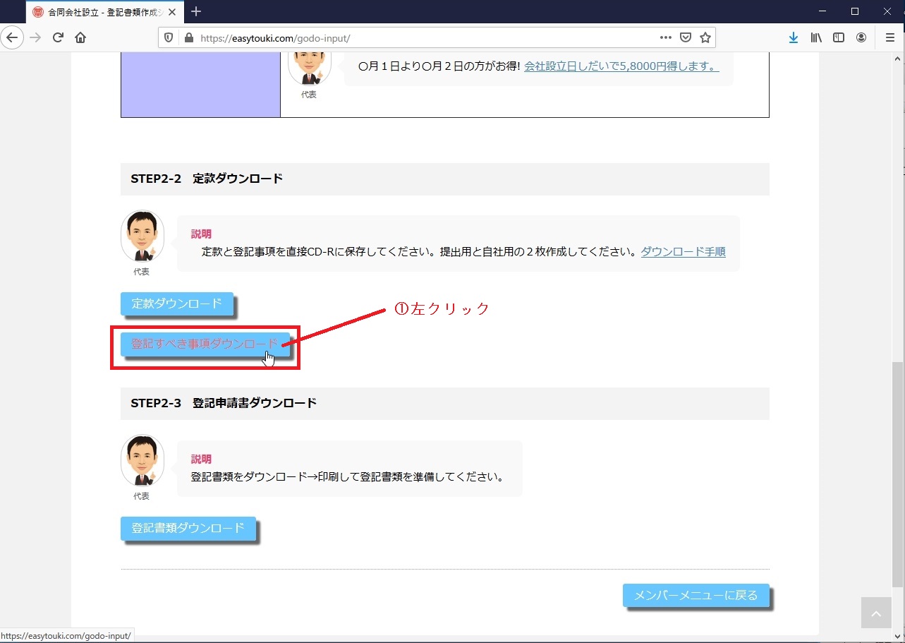 ①「登記すべき事項ダウンロード」を左クリックしてください。