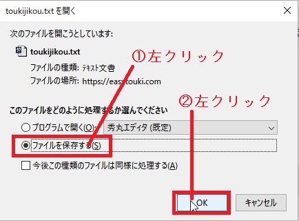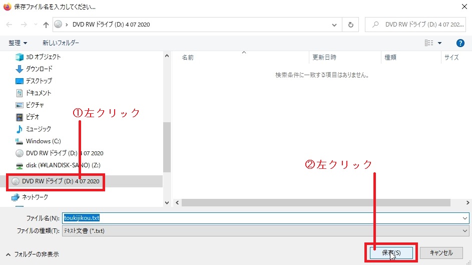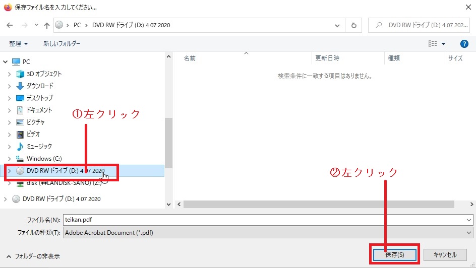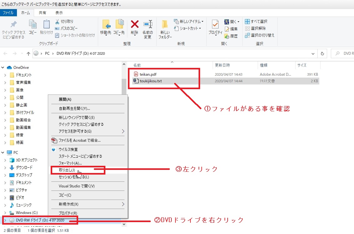 ①エクスプローラが開きますので、「teikan.pdf」と「toukijikou.txt」があるか確認してください。