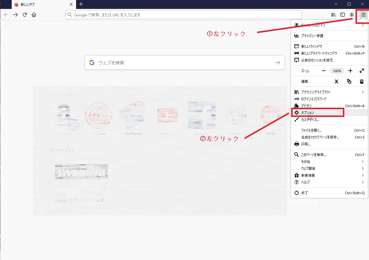 ②メニューが表示されますので、「オプション」を左クリックしてください。