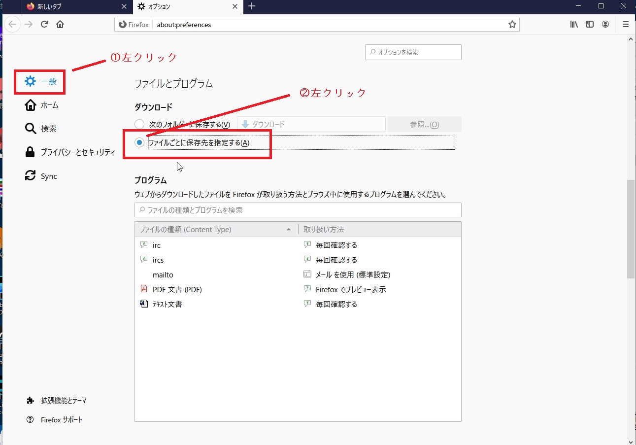 ①「一般」を左クリックし、「ファイルとプログラム」「ダウンロード」が表示されるところまで下にスクロールしてください。