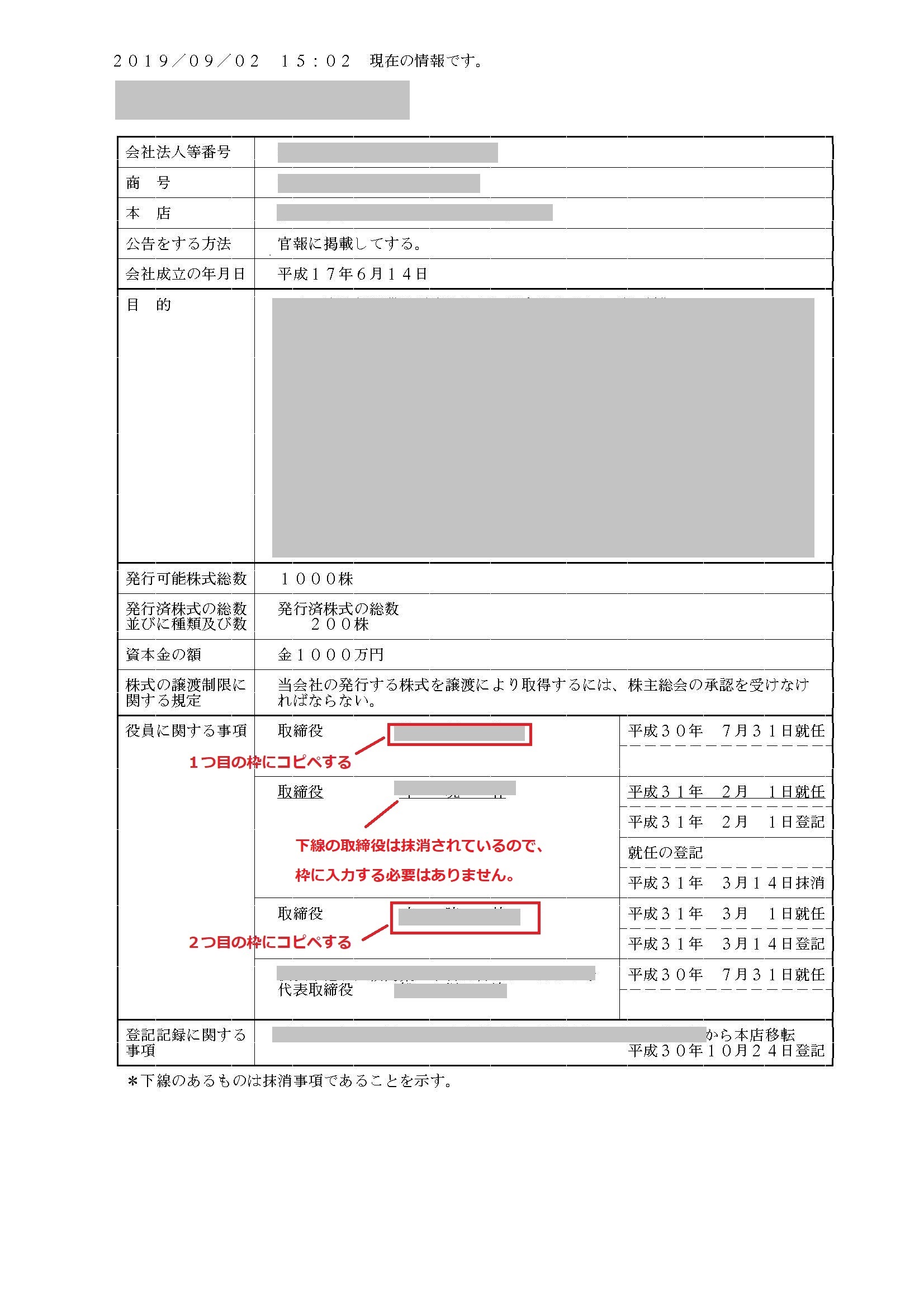 取締役の入力 03入力本店移転 2019.11.042026.01.15 目次 解説よくある質問文字化けしてしまいます。代表取締役の人も入力するのですか? 解説 代表 取締役の氏名は登記簿を参照して入力してください。 よくある質問 文字化けしてしまいます。 Qコピペすると文字化けしてしまいます。どうしたらよいでしょうか?A 異体字の場合、文字化けをしてしまいます。キーボードで正字(通常コンピュータで表示される文字)で入れてください 代表取締役の人も入力するのですか? Q代表取締役の人も入力するのですか?A はい。登記簿には代表取締役の方も取締役欄に記載されていると思いますので入力してください。